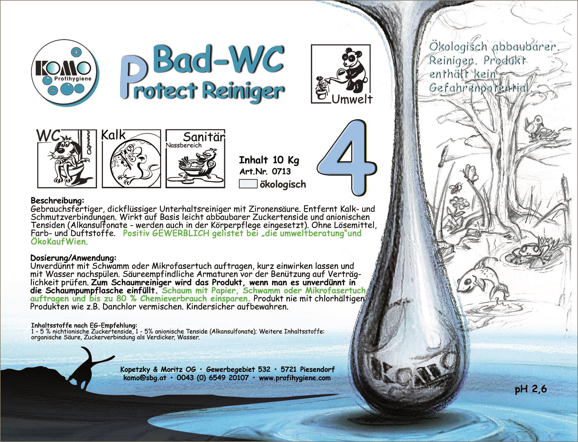 Regelmäßige Unterhaltsreinigung in Bad und WC benötigt keine die Umwelt belastenden Reinigungsprodukte. In diesem Protect Bad und WC Reiniger wurden daher die Umwelt belastenden Inhaltsstoffe ersetzt. Das Produkt ist positiv gewerblich gelistet bei "die umweltberatung und ökoKaufWien.